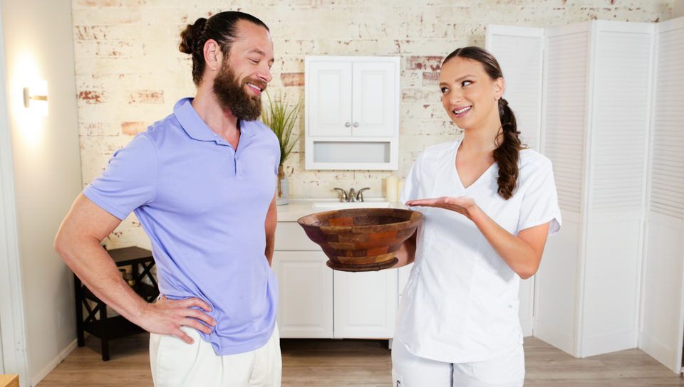 As they strip naked, they exchange some small talk about each other's backgrounds, and it's clear these two have some chemistry together. Izzy expresses how the minute she performed her first NURU massage, she felt like she was destined to do it for the rest of her life. Her passion is apparent as she pours the gel over her own body and then glides over Brad's backside. Though she tries to remain professional, there are subtle hints that Izzy is enjoying this particular massage a lot more than she expected.